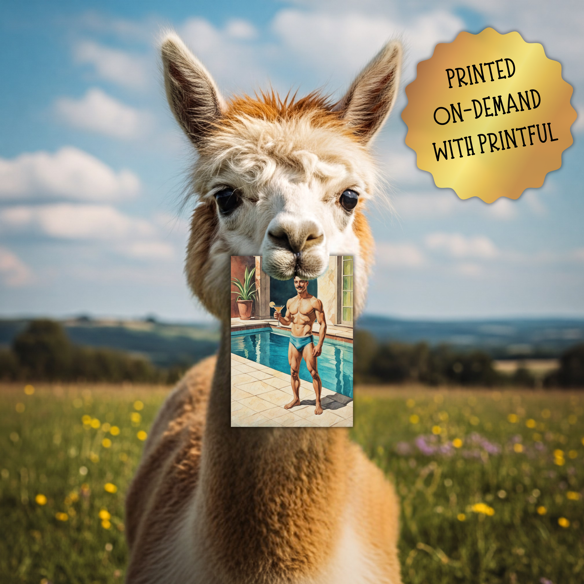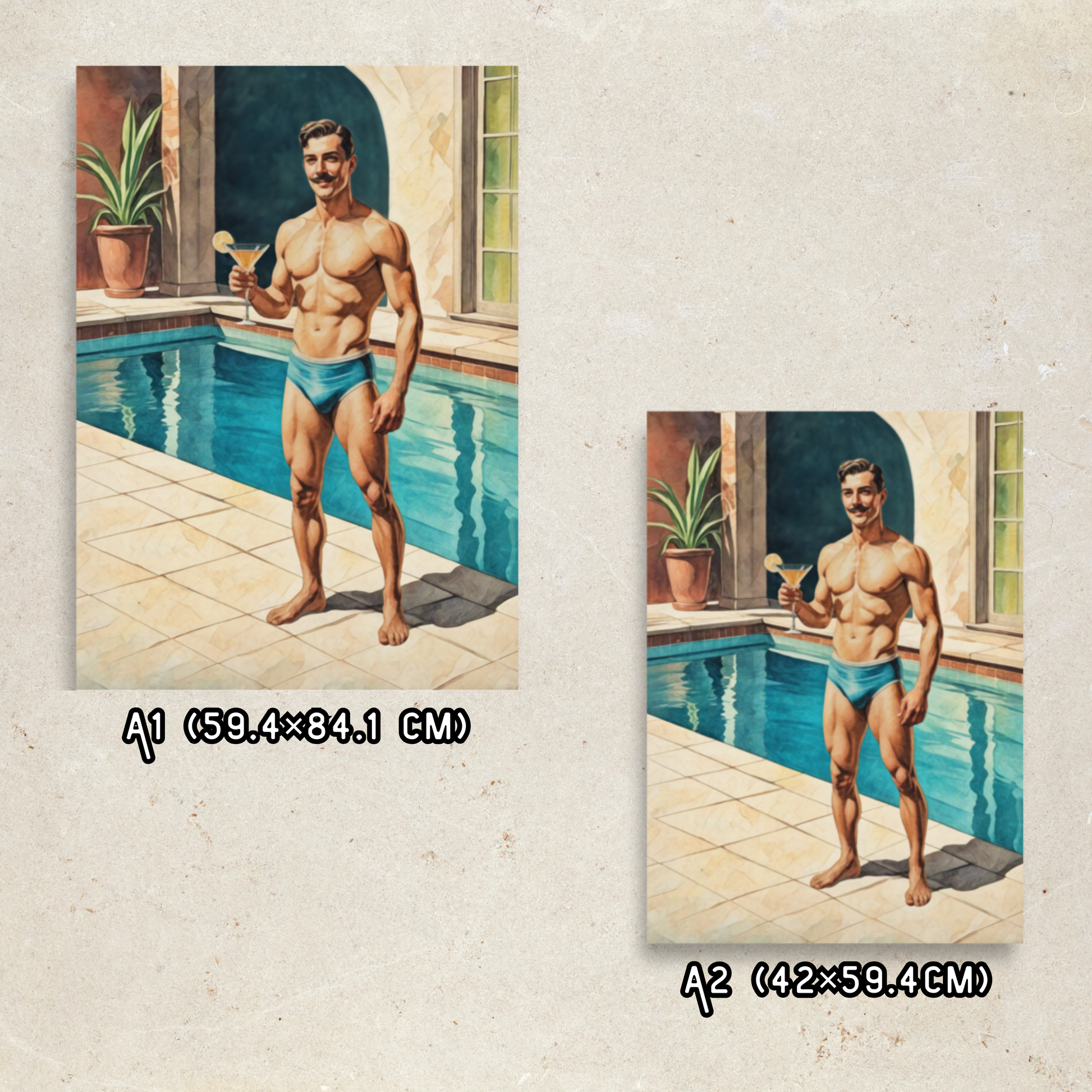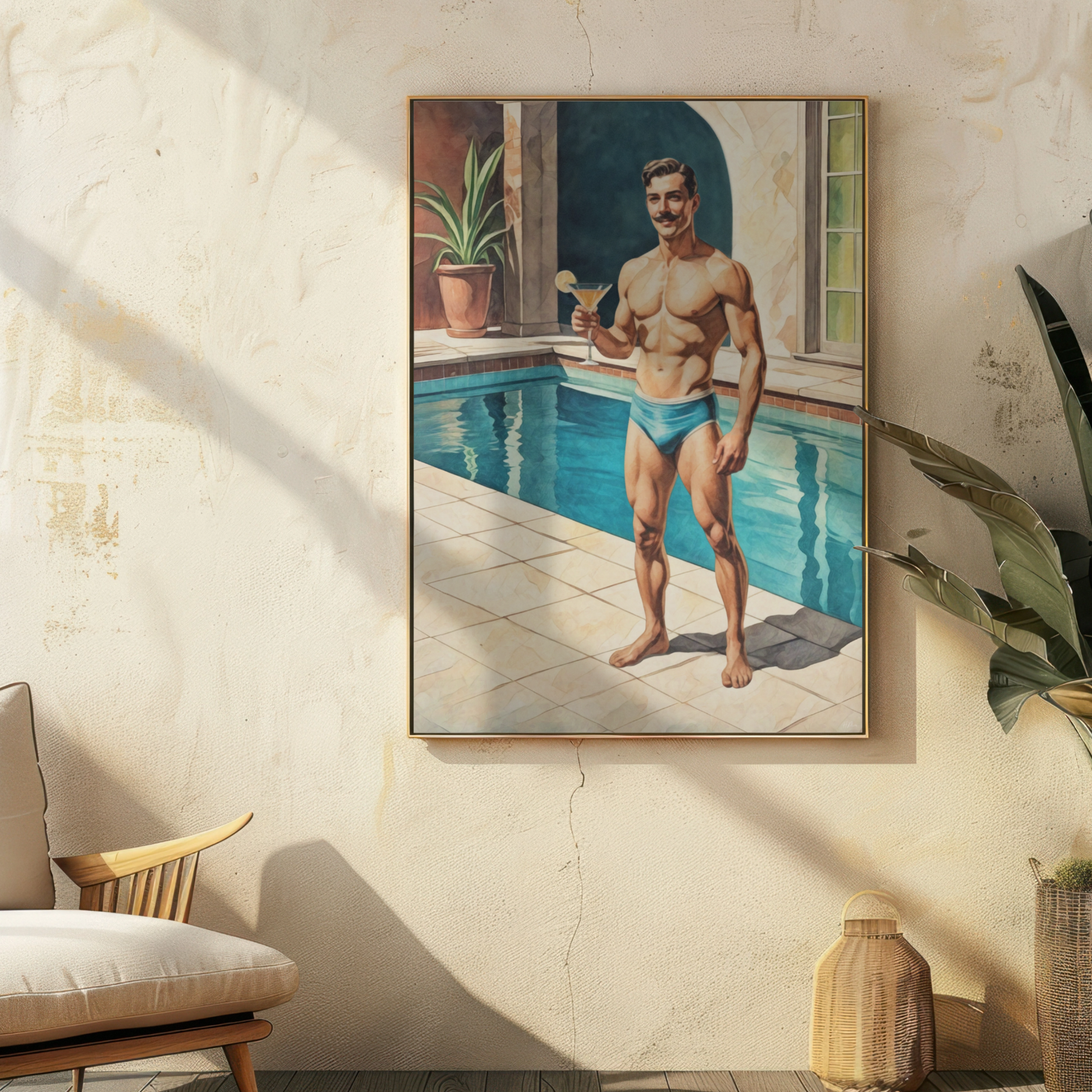 Enjoy this illustration of a classic mustachioed hunk posing confidently poolside, donning nothing but a blue swimsuit and a smirk, martini in hand. Featuring a mid-century aesthetic rich with vintage textures, this print brings timeless summer glamour to life. Perfect for fans of retro art, mid-century modern décor, or anyone who needs some flirty fun in their gallery wall. Whether you're channeling Palm Springs or pool party nostalgia, this vintage Adonis turns up the heat in all the right ways.