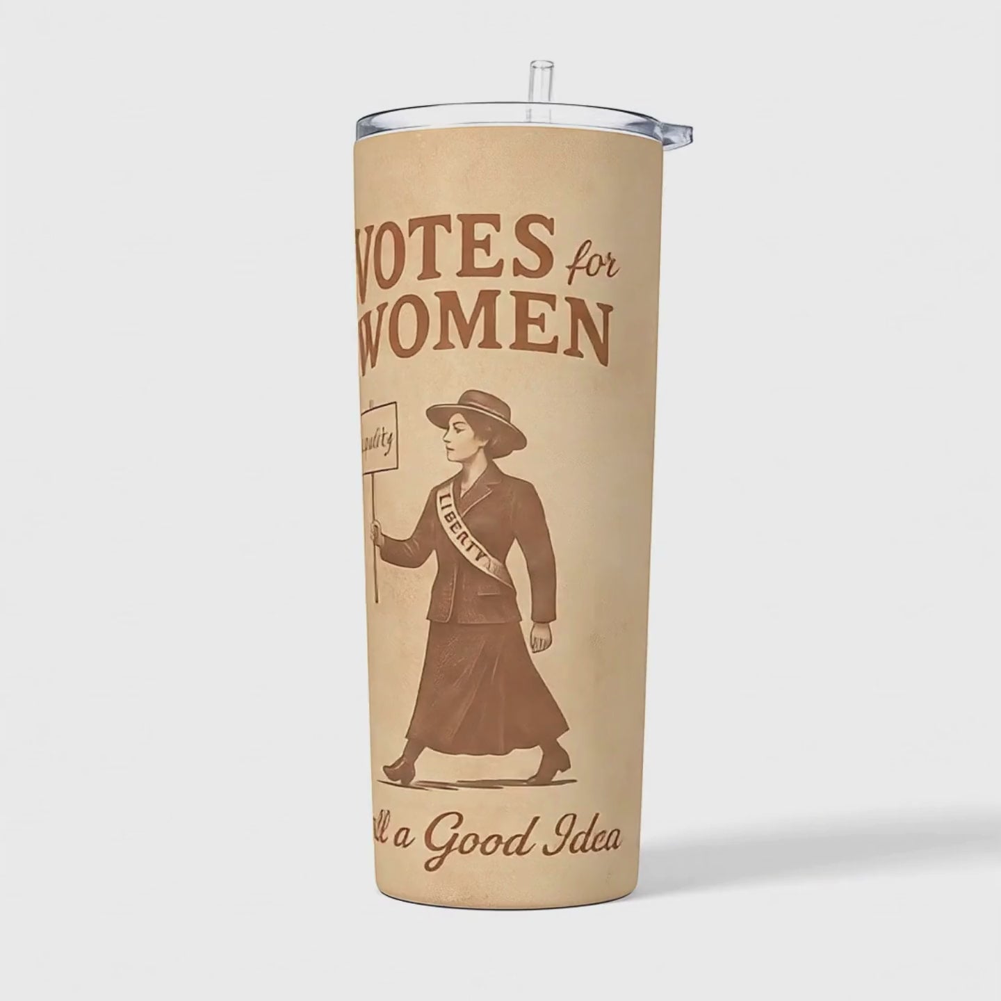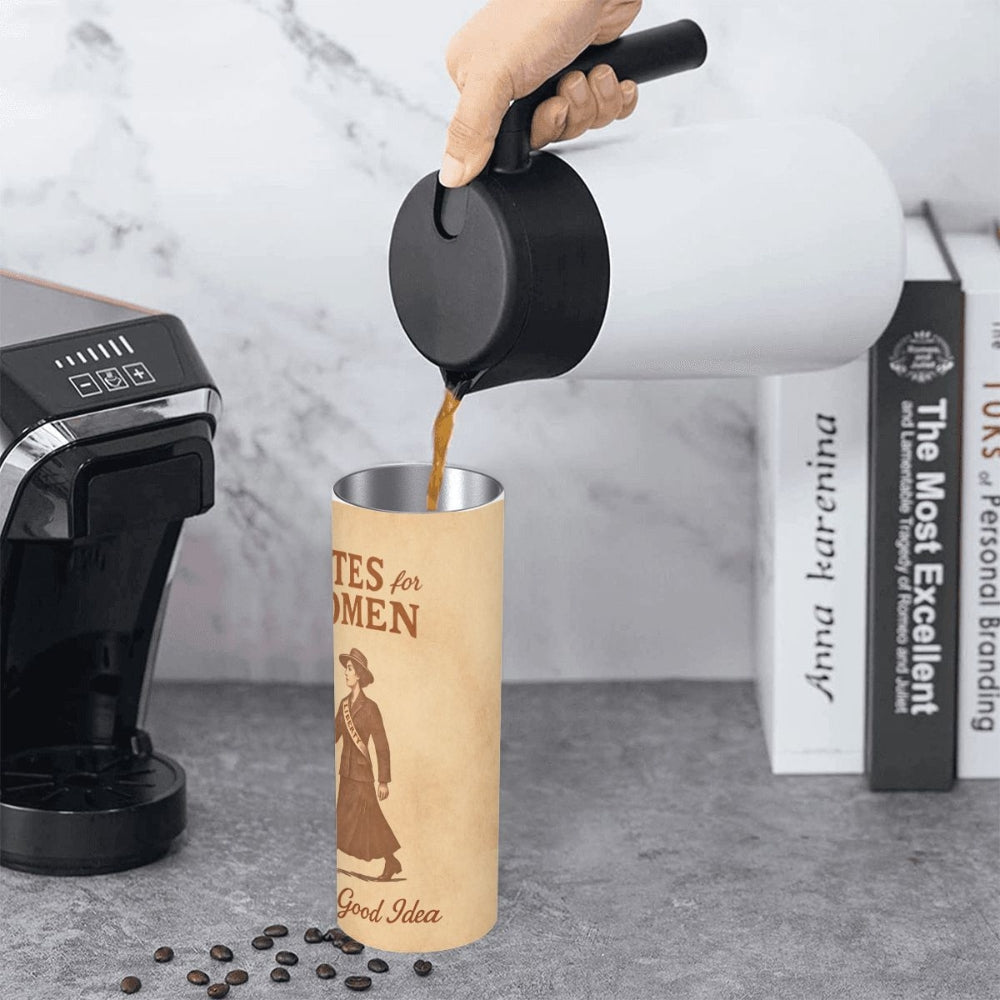 This 20oz stainless steel tumbler features a vintage-style suffrage illustration inspired by early women’s rights protest art. Designed for those who appreciate history, equality, and a little everyday rebellion, it’s both practical and powerful.